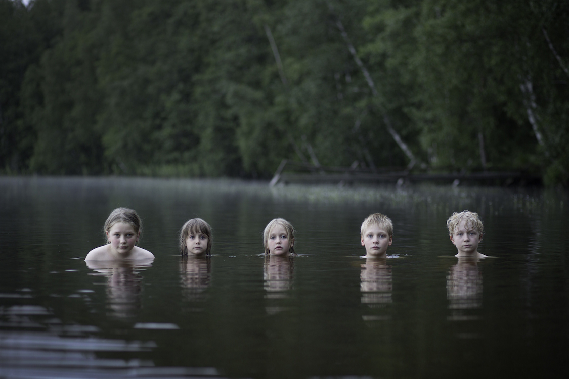 Aino Kannisto, die zwanzig Jahre lang selbst Protagonistin ihrer Bilder war, überlässt dies in der ausgestellten Serie den spielenden Kindern. Die Fotografien sind in der Wildnis der finnischen Wälder entstanden, an einem Sommerhaus am See. Es ist der traumhafte Schauplatz für eine Welt, in der die kleinen Menschen das sind, wonach ihnen gerade ist, und das tun, was ihnen gerade einfällt. Selbstvergessen hält die Froschprinzessin das glitschige Getier mit geschlossenen Augen in der Hand und steht dabei mit ihren nackten Füßen in den durchfeuchteten Nadeln des moosigen Waldbodens. Fünf Nixen tauchen aus dem dunklen Wasser des Sees empor. In der Schwärze der Nacht stehen zwei Mädchen auf geheimer Mission mit bunten Mänteln und Laternen auf einem hölzernen Steg in Schieflage, über und unter ihnen in der Spiegelung des Wassers das tiefe Blau des nordischen Himmels.